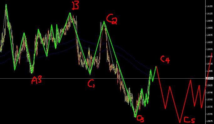 對于小時級別目前市場正運行在一個空頭的C浪4之中,也就是說市場還有一個C浪5的空頭等著,1.5690的前低是下一個目標位。