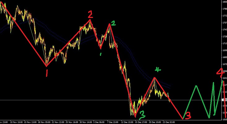 波浪理論實盤推演黃金的整個空頭大1浪不夠清晰-因為是個3波起頭,后面開始加速,此時的調整浪是非常簡單的4浪調整,我的目標位-前低,如果能再次破掉前低,后面還會繼續破一次前低,所以這第一前低和第二格前低既有保護作用,又有跟隨作用!