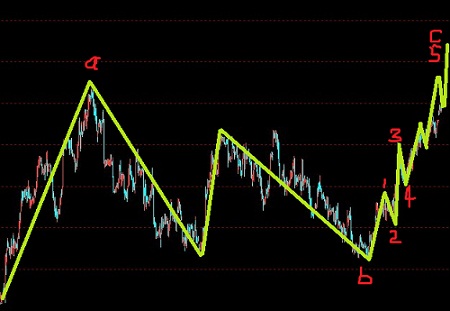 波浪理論圖解B浪走得很亂,無法數清楚,這個C浪已經在C浪5中的延長浪部位來了,也就是說離出場位很近,離反手做空不遠了,眼前最重要的不是這點魚尾,后面的空頭要盯盤,做好中線的準備.