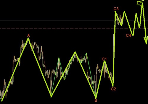 波浪理論圖解黃金目前來看是很標準的A5-B3-C5鋸齒型調整,這個C浪該發飆的地方已經出現,后面的C浪5行情不會很大,這種時局短線和中線都不好做,不需要猜測多頭趨勢,市場在這里多是個調整然后把前低破掉,然后開始重新上漲,那個時候的多頭才是需要認真把握.