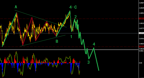 在到具體的波浪理論圖解1小時上,市場在4浪的位置走了一個A3-B浪走了三角形調整-C浪的橫盤整理,然后進入空頭節奏,也就是后面有一波5浪的行情可以做,附近的止損位就在2浪的位置,目標位0.8530!