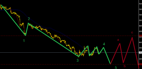 在技術層面上原油暫時有一個調整浪出現,處于第4浪的位置,如果出現三角形調整后面的第5浪就是一個空單要出場,等后面的反彈在繼續做空,整體的節奏市場后面出現比圖解中的4浪時間更長級別更大的調整,是一個持續短線的好機會!
