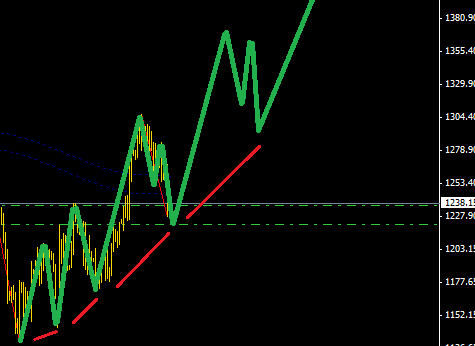 在波浪理論圖解上黃金在一個寬幅的一波流多頭里面,意思是指市場推動一波之后需要回調(diào)一段至少為前面推動浪50%的行情在去延續(xù)之前的趨勢。