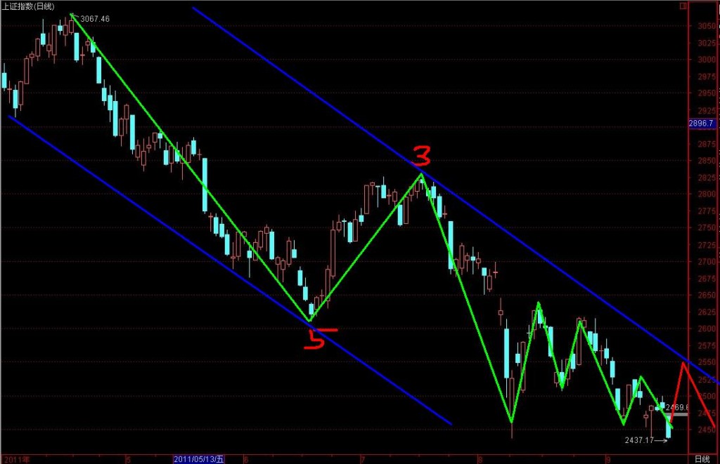 波浪理論圖解中看出,上證指數在一個30度下跌的速度中不斷創新低,之前我們分析在周圖的表現是一個很大三角形調整,內部結構是全3結構,此時正在A-B-C-D-E浪中的最后一個3浪波結構中,這里是不需要數浪的,因為市場多以3波完結!