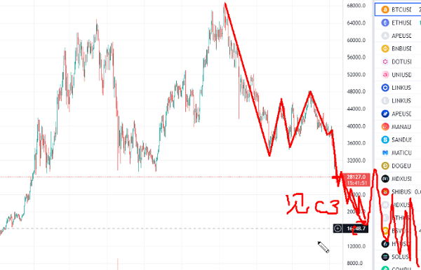 • 1.BTC從48000跌到25000明顯是個短C浪,說明市場沒有調完,首先市場可以在這里往上出現一個大一點的多頭然反彈的,比如又跑到37000;